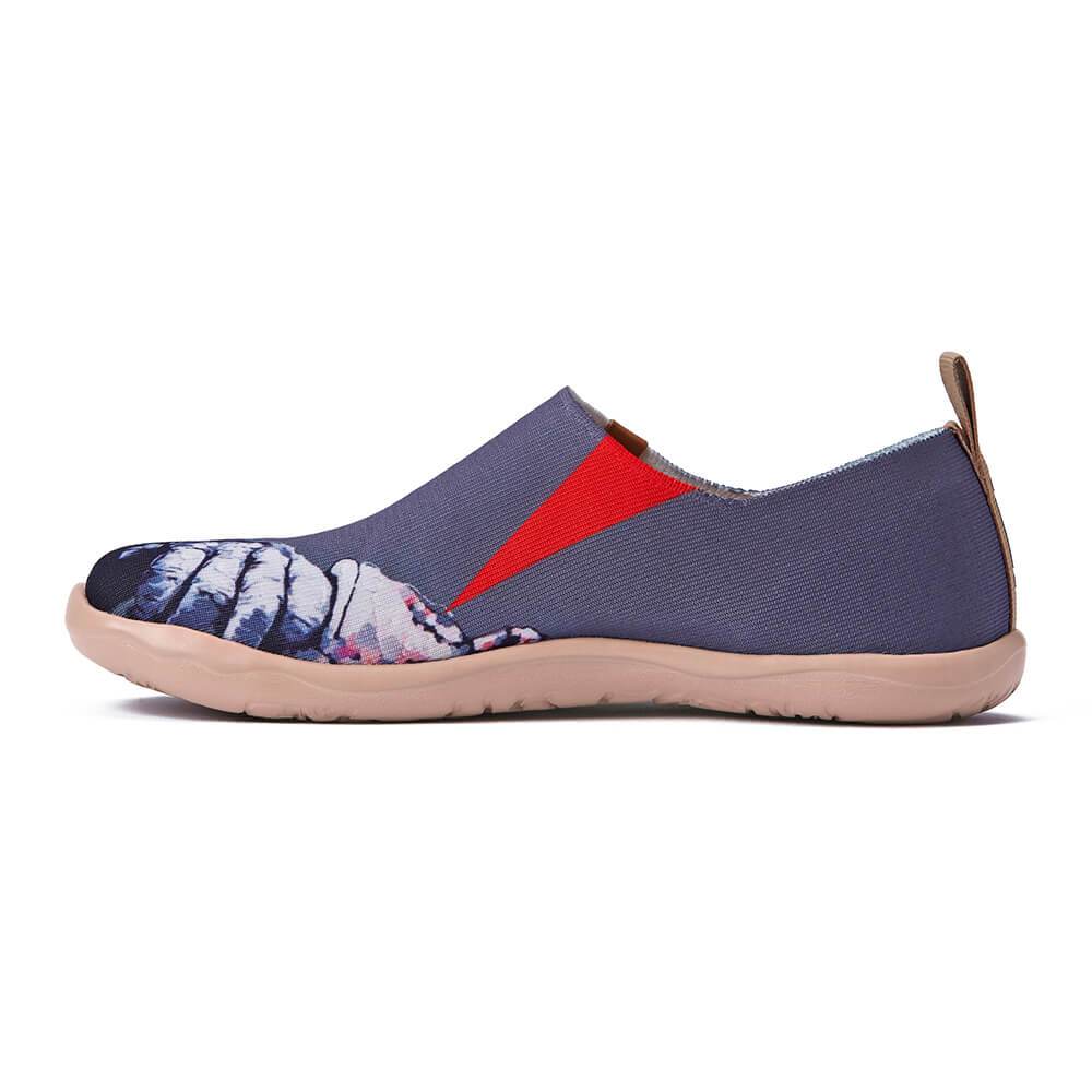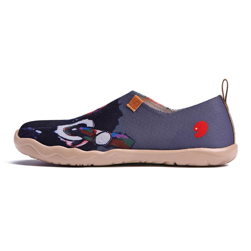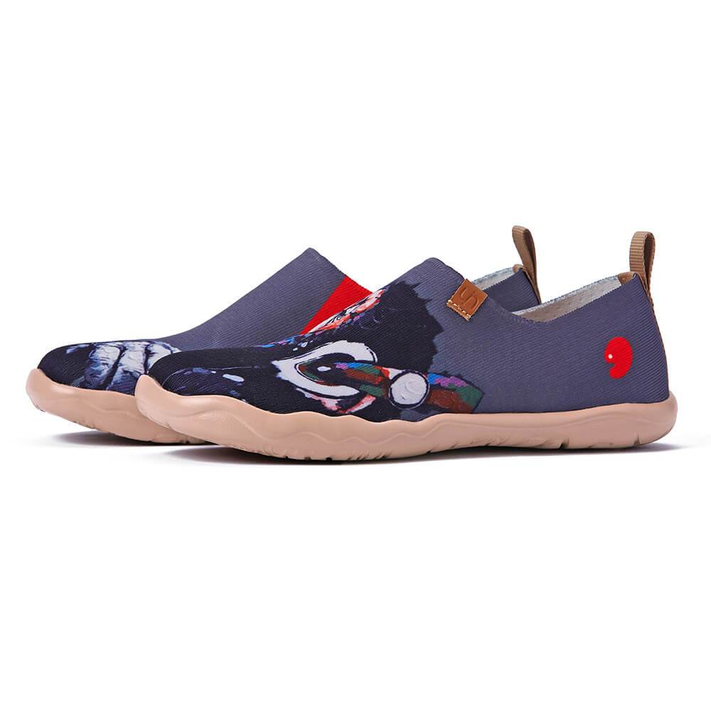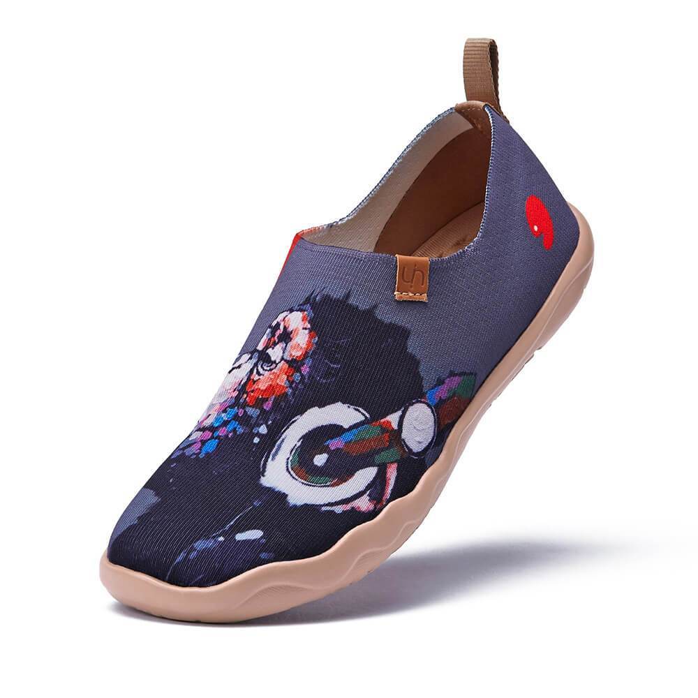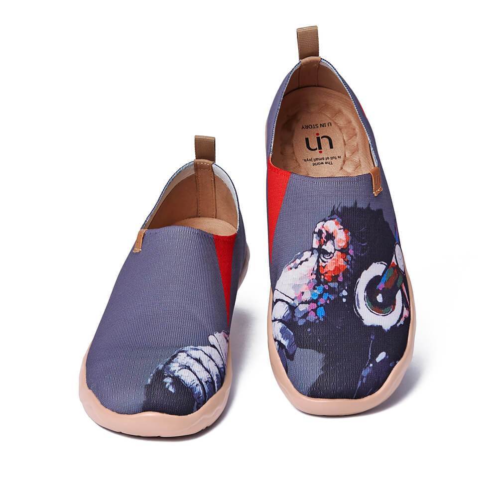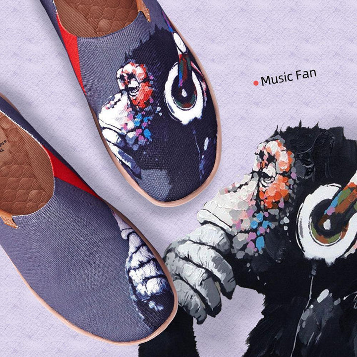 Awesome pair of shoes with a chimpanzee (or maybe an orangutan... we will never know!) listening to some cool music with his headphones. The monkey’s expression while enjoying the music is thoughtless like he is lost in the sounds of the melody that he is listening to, just like us humans when we let our imagination free during our leisure time.