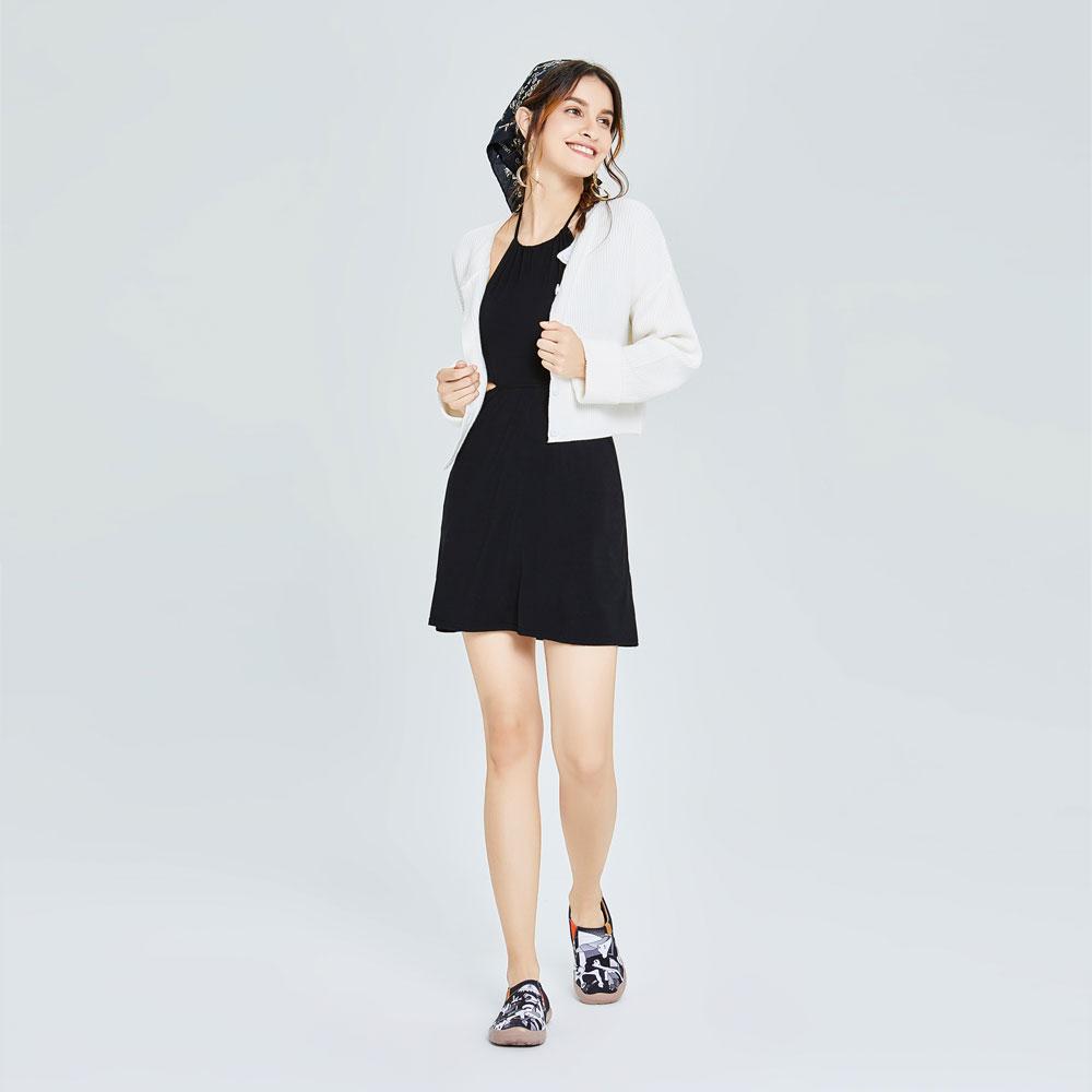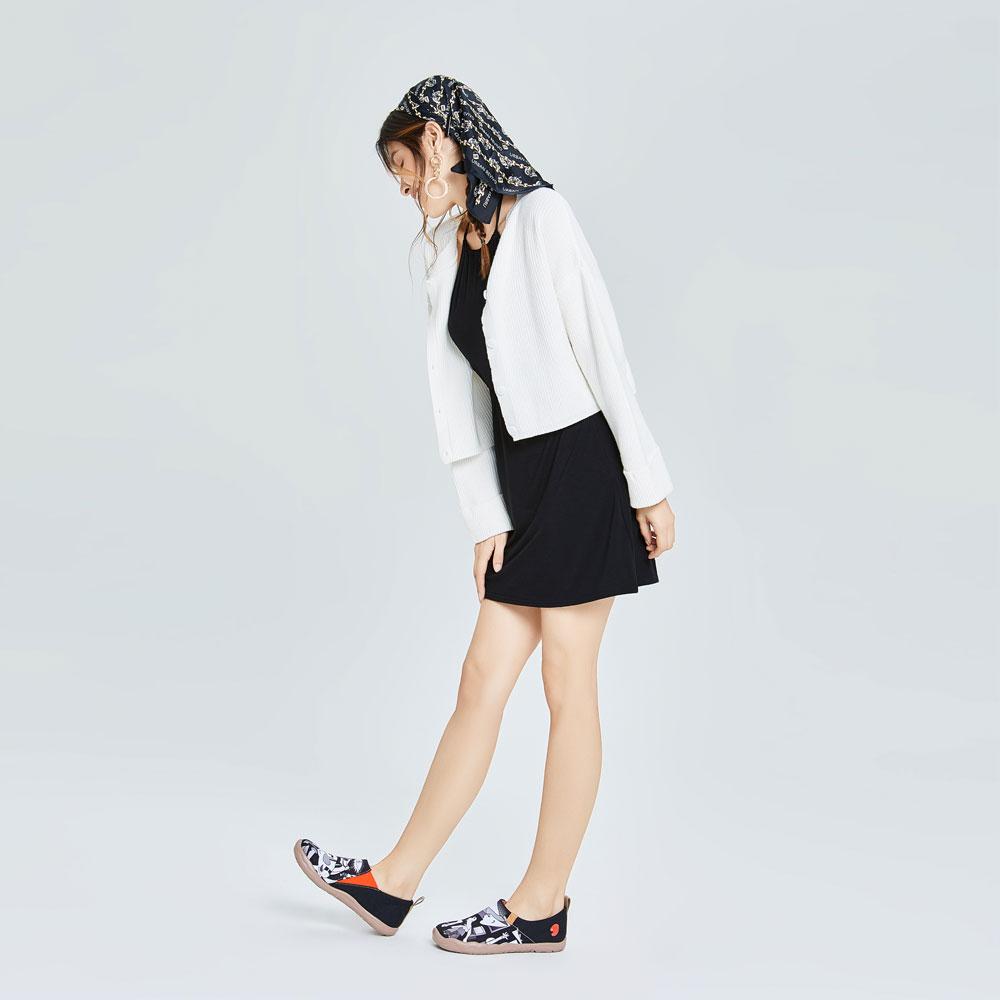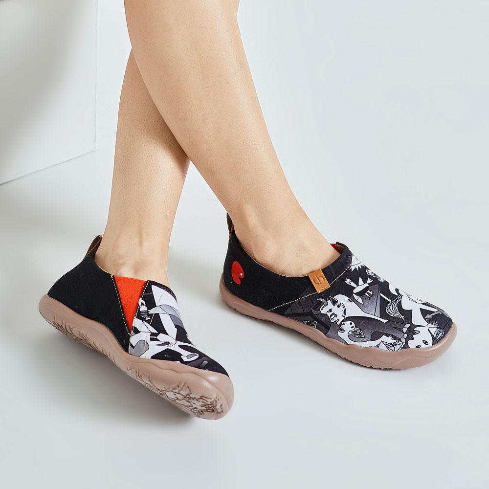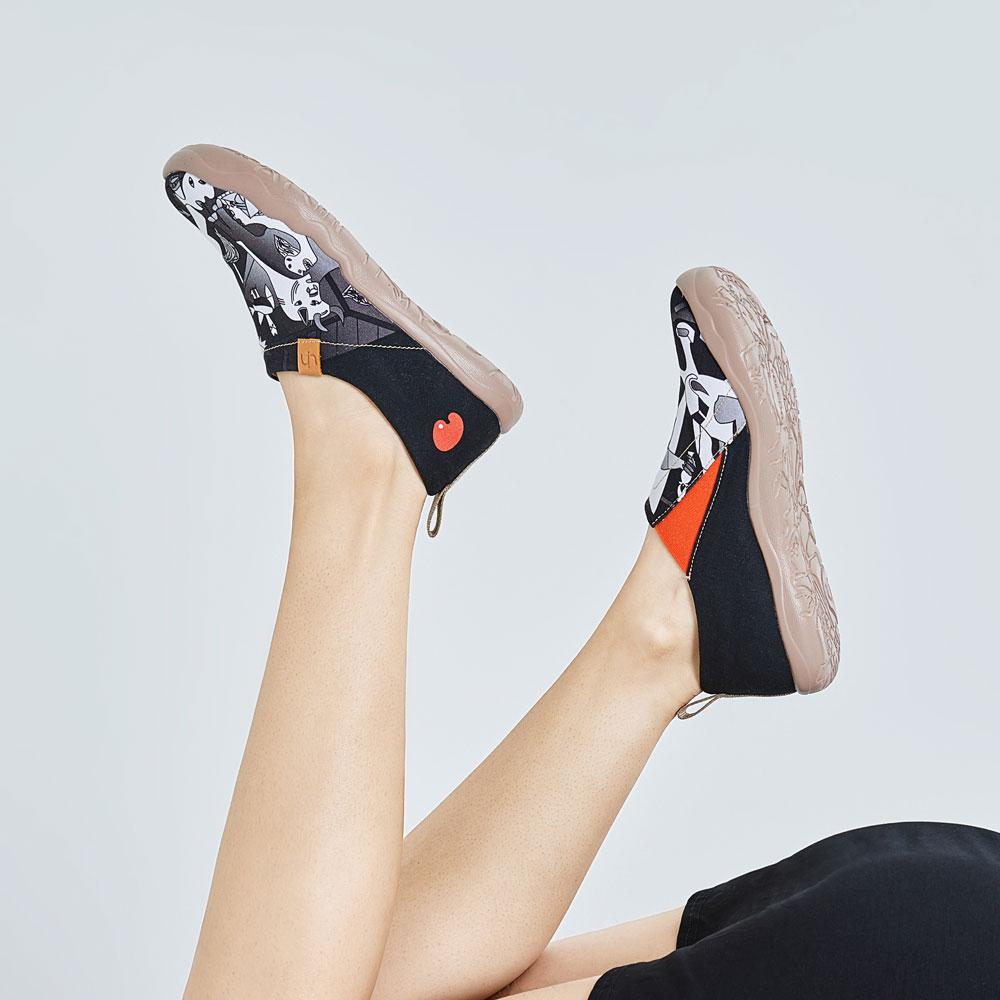 The painting adopted colors of pure black, white and grey, together with the horses howling in pain and the dying people lying on the ground with crippled bodies, to unveil the catastrophe caused by the fascist war. Misery and suffering, however, arent the theme of it, but truth and justice. A bright and big eye was painted on the top of the whole painting, like Gods gaze, to display the condemnation of Nazi. Nazi is nowhere, but our pursuit for justice and democracy is ever-lasting. Our UIN shoes hope to take the lead to express an attitudeopposition to dictatorship and advocacy of peace and democracy.