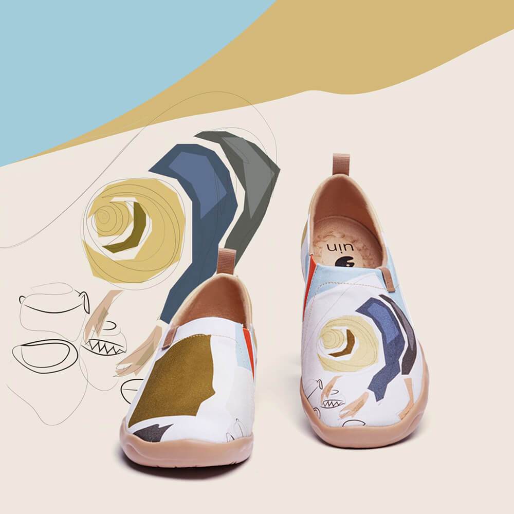 The Fishing is an artistic depiction of modern art elements combined with glips of Spanish everyday wonders. The dominant, white shoe background brings a peaceful, calm atmosphere, that matches a variety of casual outfit choices. The asymmetrical portrayal of both shoe patterns emanates with vivid aesthetical impressions that certainly capture attention.